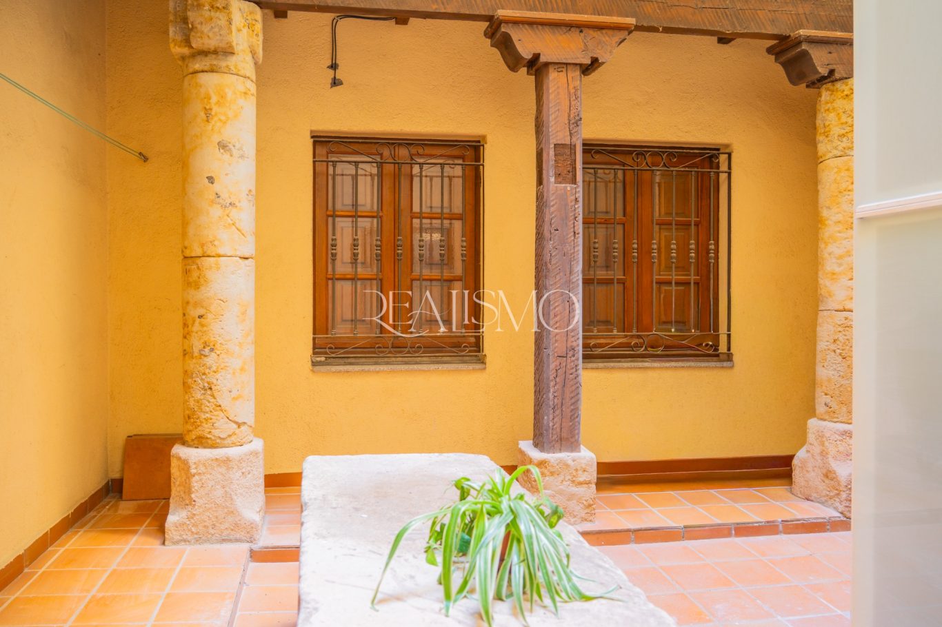 Este espacio destaca por conservar columnas en piedra de Villamayor y un banco tradicional, elementos que conectan directamente con la arquitectura salmantina más auténtica.