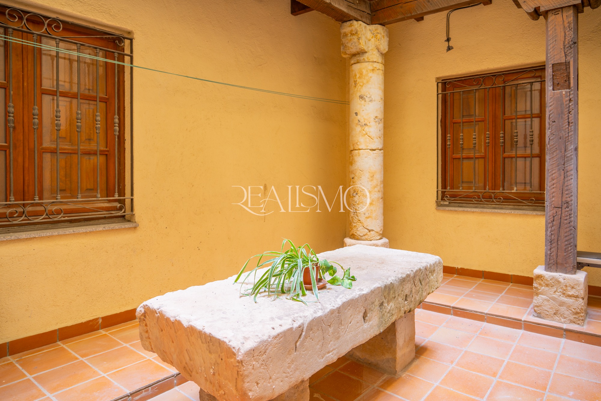 Este espacio destaca por conservar columnas en piedra de Villamayor y un banco tradicional, elementos que conectan directamente con la arquitectura salmantina más auténtica.